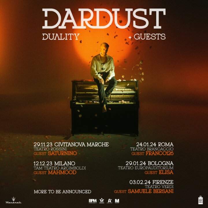 In partenza il 29 novembre dal Teatro Rossini di Civitanova Marche (MC), il Duality + Guests (BPM Concerti) di Dardust farà tappa nei principali teatri italiani, dove l’artista proporrà al pubblico presente in sala uno show futuristico in 2 atti, un viaggio musicale unico e visionario insieme ad ospiti del calibro di Saturnino, Mahmood, Franco126, Elisa e Samuele Bersani (biglietti disponibili qui).