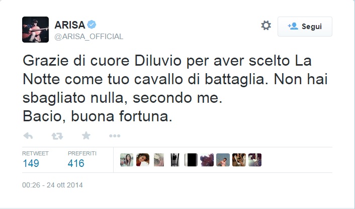 Una rivisitazione in chiave rap del successo di Arisa, canzone di capace di ottenere il secondo posto al Festival di Sanremo 2012. Un grandissimo successo capace di rinnovare la carriera di Arisa, con un look rivoluzionato che segnò l’inizio di un percorso artistico in continua ascesa che la portò in breve tempo a diventare giudice di XFactor e vincitrice dello stesso Festival di Sanremo nel 2014. Quella di diluvio di riproporre con il suo stile La Notte è stata una scelta pienamente appoggiata dall’artista “originale”, che sin dall’esecuzione da parte di diluvio nella prima puntata dello show ha voluto esplicitare la propria approvazione nei confronti di questa nuova versione: