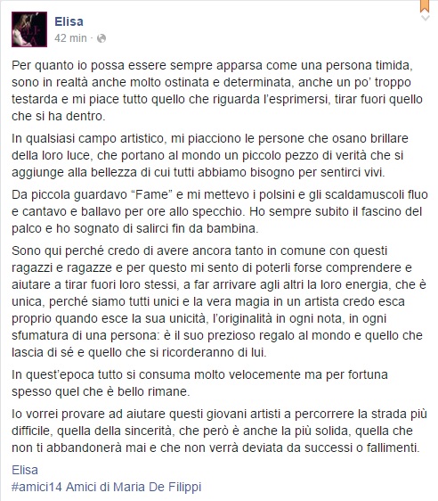 Per farlo ha scelto di pubblicare un lungo post sulla propria pagina Facebook, nel quale inizia con lo spiegare che l’apparente timidezza che molti hanno notato presidiare la sua indole, in realtà convive con una grande determinazione che si infiamma quando si tratta di doversi esprimere artisticamente. Per Elisa l’aver accolto l’invito di Maria De Filippi coincide con il voler investire energie nel riconoscere il valore dell’unicità degli artisti, mettendo a disposizione la sua esperienza abbinata all’originalissimo talento che ha reso una granitica certezza della musica italiana la scoperta di Caterina Caselli.