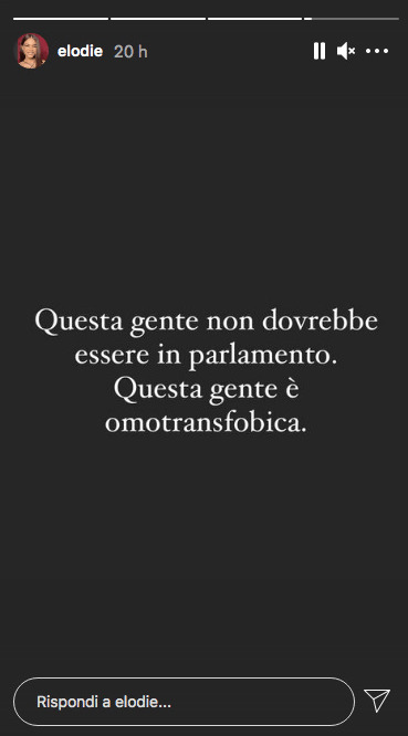 La cantante ha usato questa volta parole durissime, mai quanto la “durezza” della violenza che subiscono ogni giorno le persone omosessuali. Parole affidate al suo profilo Instagram dopo aver ricondiviso un articolo di un noto quotidiano che titolava “La Lega è pronta a fermare la legge Zan contro l’omofobia“. “Siete indegni” ha scritto Elodie, “Questa gente non dovrebbe essere in parlamento. Questa gente è omotransfobica“.