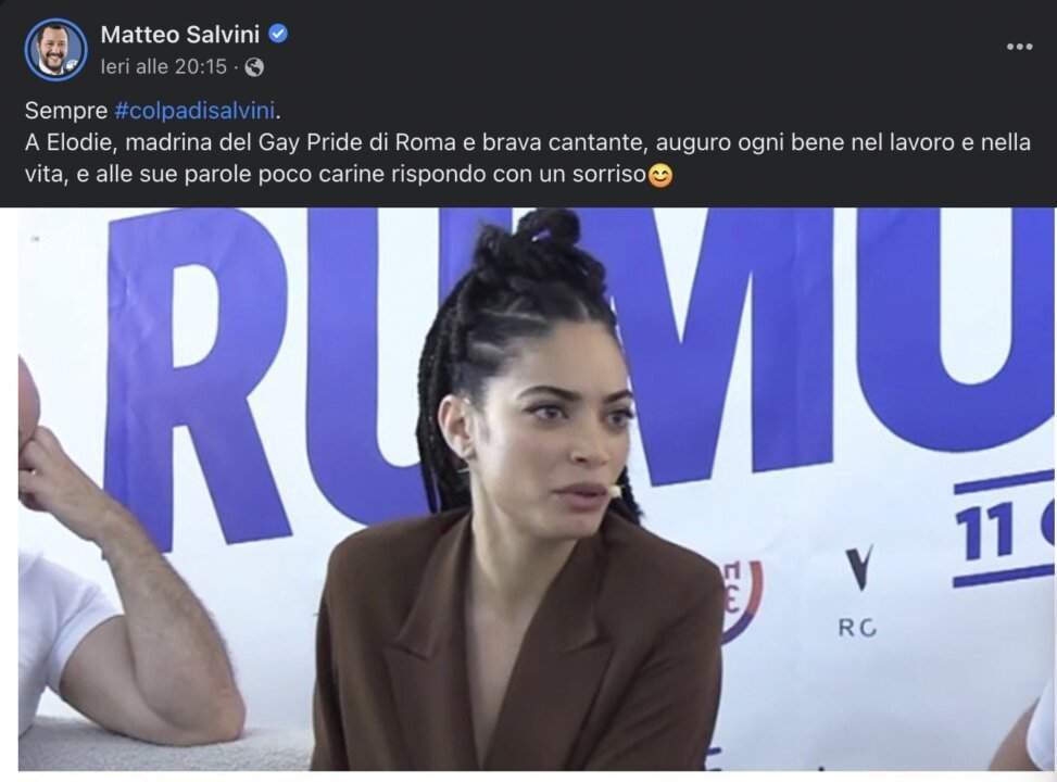 Sempre #colpadisalvini. A Elodie, madrina del Gay Pride di Roma e brava cantante, auguro ogni bene nel lavoro e nella vita, e alle sue parole poco carine rispondo con un sorriso.