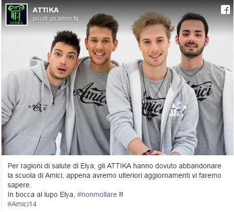L’attività degli Attika continua a crescere, arrivando ad una delle vetrine più ambite nel panorama televisvo-musicale: nel 2014 la band entra a far parte della scuola Amici di Maria De Filippi, dove conquistano la simpatia del pubblico arrivando ad un passo dalla fase finale con un’inatteso problema di salute proprio per Elya, che a gennaio 2015 rovinerà la festa portando il gruppo ad abbandonare il programma.