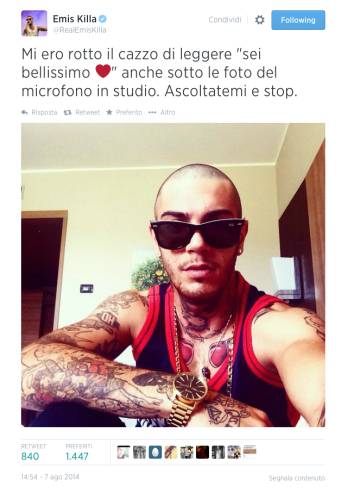 Emis Killa aveva già manifestato fastidio per questa situazione (anche nella nostra intervista, che potete leggere QUI) twittando alla sua schiera, decisamente ampia (383.000) di follower, che voleva essere seguito per la sua musica, che era stufo dei cori di “Sei bellissimo” ai concerti, e che avrebbe desiderato più commenti, positivi o meno, sulla sua musica.