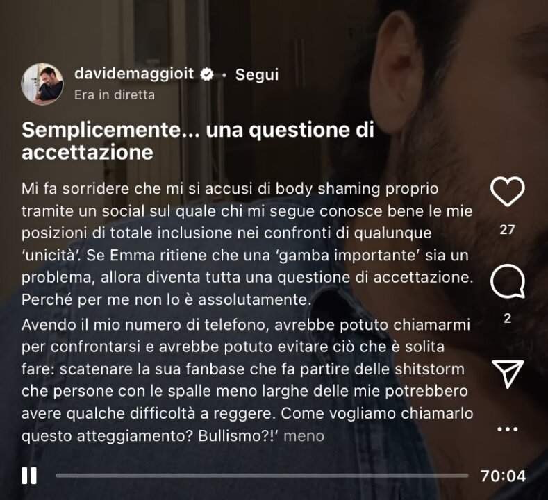 Emma Marrone ha infatti usato l’episodio più che per difendere sé stessa per ricordare a tutte le ragazze, giovani e non, che la seguono, di non farsi colpire da questo tipo di battute che, a chi più e a chi meno, vanno ad aprire squarci nelle insicurezze di ognuno (qui trovate le parole dell’artista e la risposta del giornalista).