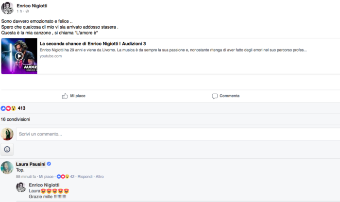 Tra l’altro l’esibizione del cantautore ha conquistato anche Laura Pausini, da sempre attenta ai nuovi talenti, che ha fatto i complimenti ad Enrico con un commento sulla sua pagina Facebook.