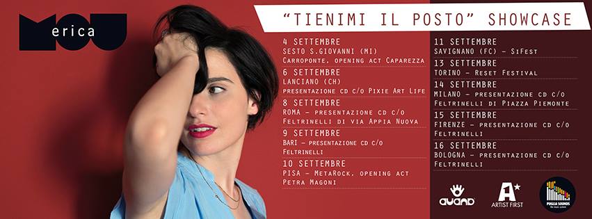 A quattro giorni dalla pubblicazione di Tienimi il posto, Erica Mou svela in anteprima attraverso la sua pagina Facebook tutte le date degli showcase di presentazione del suo nuovo album, il quarto dopo Bacio ancora le ferite (2009) E’ (2011) e Contro le onde (2013). Il disco che segna l’interruzione del rapporto della cantautrice pugliese con la scuderia Sugar di Caterina Caselli uscirà per Auand Records con Artist First, l’etichetta discografica che ha prodotto il primo album di Erica intitolato Bacio ancora le ferite (2009) da cui vennero estratti e reincisi molti brani che finirono poi nella tracklist del disco successivo. In attesa dello start effettivo di questa piccola tournèe di presentazione, la cantante è impegnata sul set del videoclip che accompagnerà il secondo singolo estratto intitolato Se mi lasciassi sola, che arriverà sulla scia di Ho scelto te, il brano apripista del progetto uscito lo scorso giugno disponibile anche in una versione remix curata da Alex Farolfi e Stefano Palermo scaricabile da iTunes.