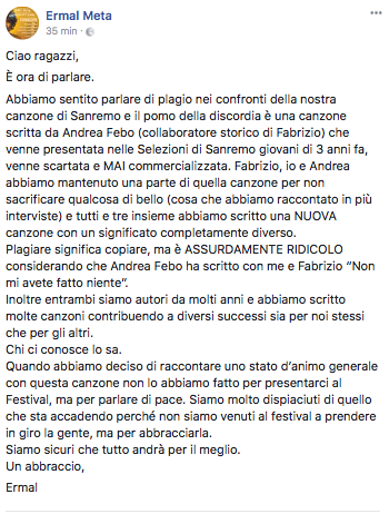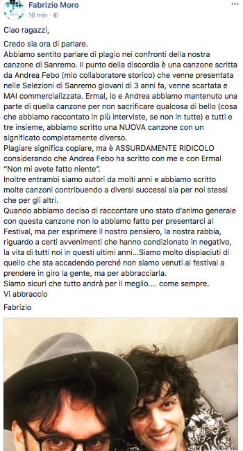 Abbiamo sentito parlare di plagio nei confronti della nostra canzone di Sanremo. Il punto della discordia è una canzone scritta da Andrea Febo (mio collaboratore storico) che venne presentata nelle Selezioni di Sanremo giovani di 3 anni fa, venne scartata e MAI commercializzata. Ermal, io e Andrea abbiamo mantenuto una parte di quella canzone per non sacrificare qualcosa di bello (cosa che abbiamo raccontato in più interviste, se non in tutte) e tutti e tre insieme, abbiamo scritto una NUOVA canzone con un significato completamente diverso.