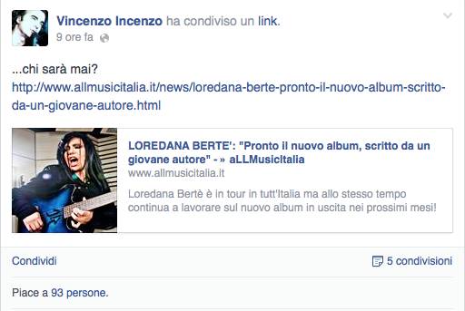 Semplice, proprio oggi nel suo profilo Facebook l’autore ha postato il nostro articolo di cui sopra con la dicitura: “… chi sarà mai?“. Quindi, a meno che Incenzo abbia postato l’articolo per curiosità personale, dovrebbe essere proprio lui il nome che potrebbe riportare Loredana Berté di nuovo alla ribalta con un album di inediti.