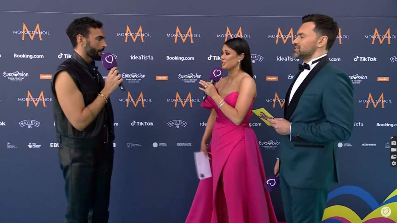 Infine Marco Mengoni, un altro degli artisti più “cercati” – arrivato sul carpet in gilet e pantaloni di pelle nera firmati Versace, ha sostituito lo smanicato con una giacca sartoriale per il tratto all’ombra del percorso. Ai microfoni di Quek e Miroshnychenko, Marco ha dichiarato di non vedere l’ora di salire sul palco e di vivere la sua seconda partecipazione all’Eurovision (a 10 anni di distanza dal 7° posto di Malmö 2013). Inoltre, ha ribadito più volte il suo legame con il logo di questa edizione (“United By Music”, uniti dalla musica) e ha raccontato di starsi preparando alle performance con lunghe sessioni di meditazione e respirazione controllata.
