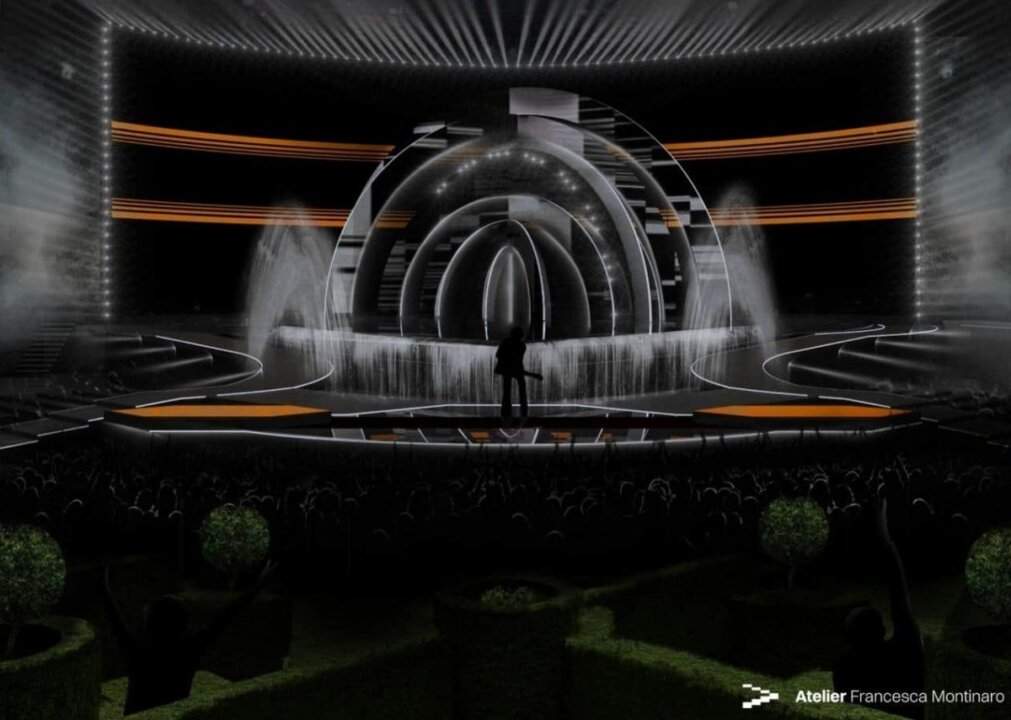 Il palco vedrà di fronte al ledwall una struttura con 6 archi concentrici e mobili che daranno vita a dinamiche con spettacolari giochi di luce, il tutto incastonato tra elementi che richiamano i giardini all’italiana e l’acqua.