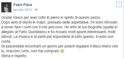 “Ci tengo a dire una cosa sul testo di Fabri Fibra: a me personalmente è piaciuto molto, l’ho trovato sinceramente ironico, divertente e non affatto una critica a Vasco Rossi. Voglio una vita spericolata come Vasco… Non ha mica detto che Vasco è un pirla. Tutta questa polemica non ha nessun senso. Sono subito andato a sentirla, l’ho comprata (non tutto l’album perché sono di braccio corto). L’ho sentita e devo dire che è molto carina e che non mi sono affatto offeso. E quella del tasto è chiaramente una metafora, spingi un tasto e riempi lo stadio. Ovvio che il tasto bisogna trovarlo e ci ho messo tanti anni”.