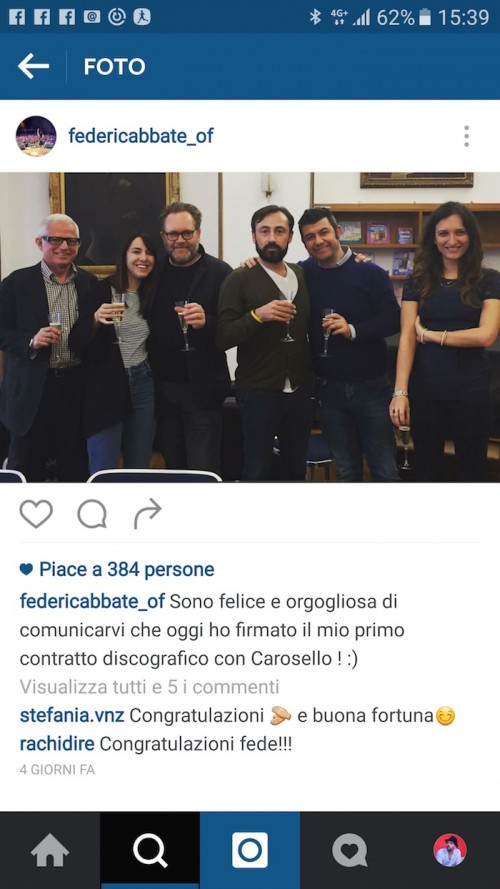 “Sono felice ed orgogliosa di comunicarvi che oggi ho firmato il mio primo contratto discografico con Carosello ! 🙂 ”