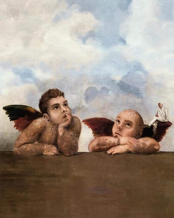 Due le immagini condivise dai cantanti. Nella prima c’è annalisa con un collarino di strasse e un lecca lecca che rievoca le luci stroboscopiche delle discoteche anni ’80. Nella seconda, invece, Fedez e J-Ax sono due angeli tatuati con lo sguardo rivolto al cielo. Sull’ala di J-Ax anche un piccolo DJ Jad vestito di bianco a gambe incorciate.