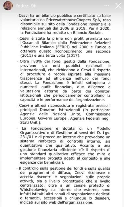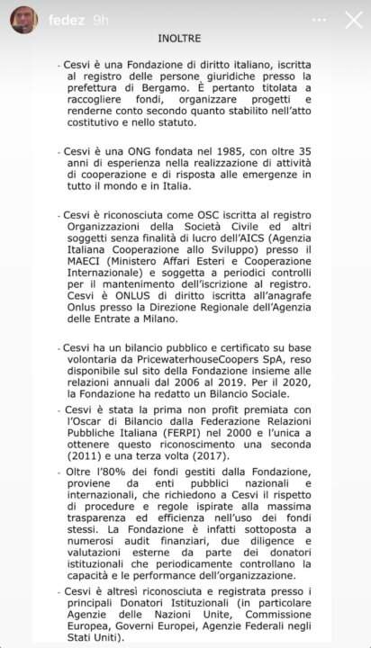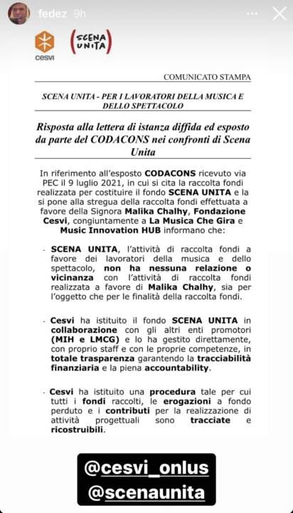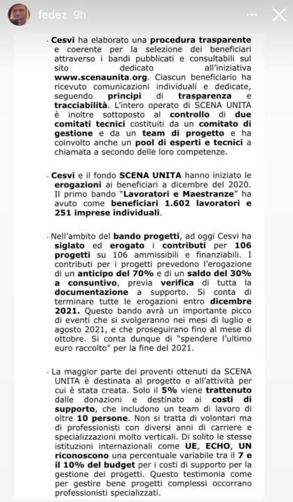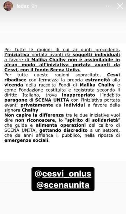 Nelle storie a seguire Fedez pubblica la risposta ufficiale del Cesvi che ha amministrato la raccolta fondi di Scena unita. Qui a seguire vi pubblichiamo il testo integrale pubblicato su Instagram da Fedez che si conclude con queste parole: