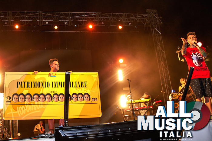 Sfilano sul palco le sue ironie, raccontate con il meccanismo della ribellione esortativa, sempre indirizzata al popolo ovviamente. Sul palco vediamo il rapper in versione super-eroe nel brano Alfonso Signorini (Eroe Nazionale), vestito da assorbente gigante (e anche sporco) in Vivere In Campagna Pubblicitaria (per dire che “il business della discografia è ormai posseduto dai brand e dalle attività di product placement”), il maestro De Gregori che appare in video per elogiare il ragazzo, spot e martellamenti televisivi si rincorrono nella presa in giro del grottesco catodico; Fedez si spoglia un pò, fa caldo, lancia false banconote da 500 euro ed elargisce assegni con tanti zeri (con la faccia di Renato Zero ) seduto su un gigantesco lingotto d’oro dove sembra stare a proprio agio…