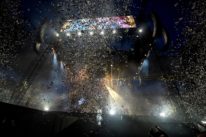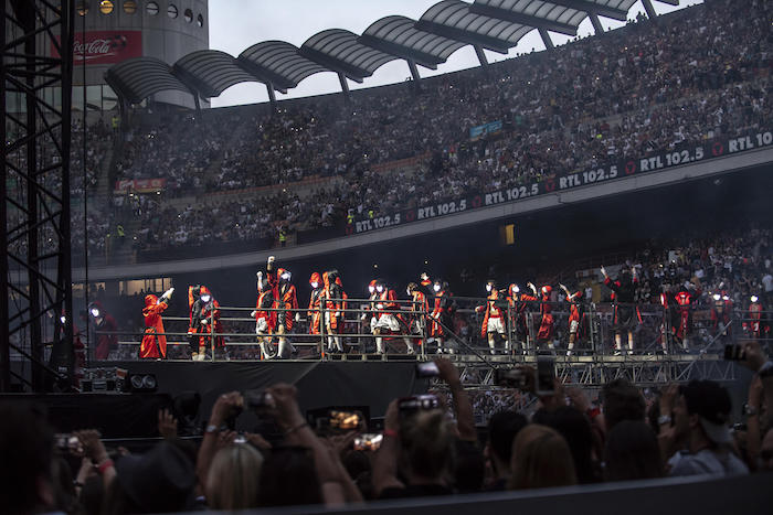 Uno stadio pieno come non era mai successo per un evento musicale. Settantanovemila cinquecento spettatori divisi tra il prato e gli spalti (utilizzati, per la prima volta, per intero, grazie al palco posto a centro campo), braccialetti luminosi che si accendono a ritmo di musica aumentando la già ricca scenografia fatta di led, neon e fuochi d’artificio.