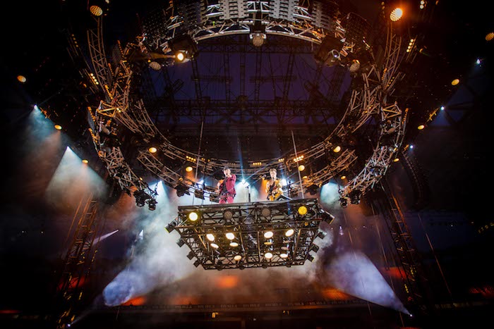 Un palco rotante con diverse pedane che si sollevano per portare J-Ax e Fedez verso il cielo, verso il pubblico, il loro pubblico.