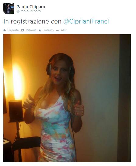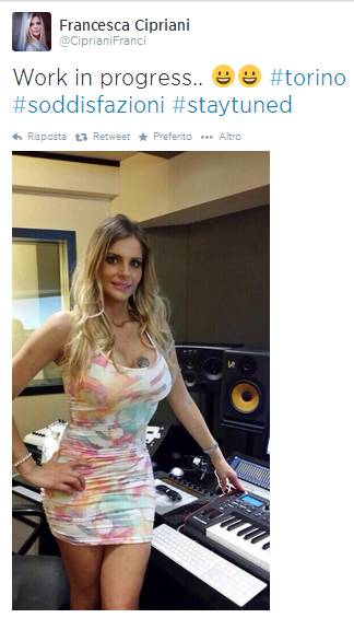 Stiamo parlando di Francesca Cipriani, volto amatissimo del piccolo schermo, che ha deciso di mettersi alla prova anche come cantante. E non è un annuncio da poco: la Cipriani, raggiante in un abito multicolor iperattillato, ha condiviso via Twitter l’inizio di questa nuova avventura discografica direttamente da uno studio di registrazione torinese.