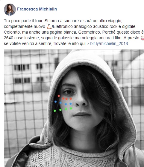 Ma già nei giorni scorsi Francesca aveva dimostrato di non vedere l’ora di iniziare l’avventura live. “Tra poco parte il tour. Si torna a suonare e sarà un altro viaggio, completamente nuovo! Elettronico analogico acustico rock e digitale. Colorato, ma anche una pagina bianca. Geometrico. Perché questo disco è 2640 cose insieme, sogna le galassie ma noleggia ancora i film.”