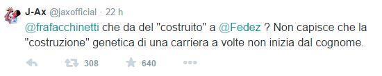 L’apoteosi è ieri. J-Ax, persona che stimo e che ascolto da quando avevo 12 anni, accorre in tua difesa e su twitter mi insulta così “Facchinetti che dà del “costruito” a Fedez ? Non capisce che la “costruzione” genetica di una carriera a volte non inizia dal cognome”. Io sarò pure figlio di papà ma mio papà non interviene per difendermi, sono adulto, mentre Fedez ha bisogno del fratello maggiore. Evidentemente ho toccato un tasto dolente, visto che entrambi (J-ax e Fedez) hanno autori che scrivono le loro battute/metafore e legittimamente, difendono il loro diritto a costruire una carriera anche così.