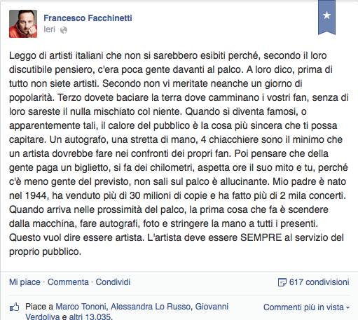 Ma in fondo a chi fosse diretto il messaggio di Facchinetti è davvero la cosa meno importante. Sarebbe importante invece che le sue parole, così lucide e concrete, arrivassero a tutti quelli che hanno la fortuna di fare questo lavoro (sì, perché è opportuno non dimenticare che poter fare della propria passione un lavoro è un lusso che pochi possono permettersi) e li spingesse a ridimensionarsi e a considerare il loro lavoro in tutta la sua totalità che ha un prima e un dopo, dando il giusto valore al rapporto con le persone che li sostengono.
