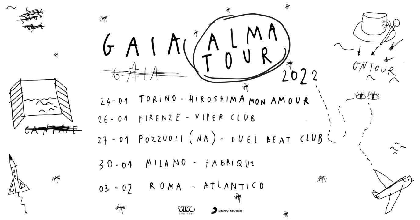 Reduce dal lancio del suo nuovo singolo, Nuvole di zanzare, primo estratto ufficiale dall’album Alma, in uscita a fine ottobre, Gaia annuncia le prime date live legate al nuovo disco.