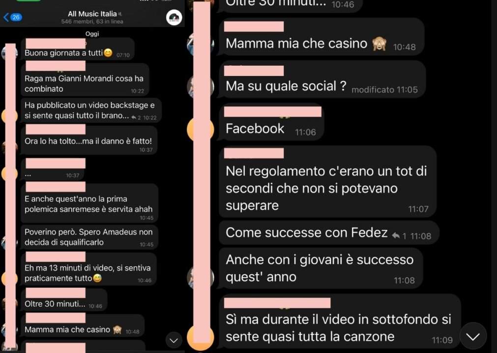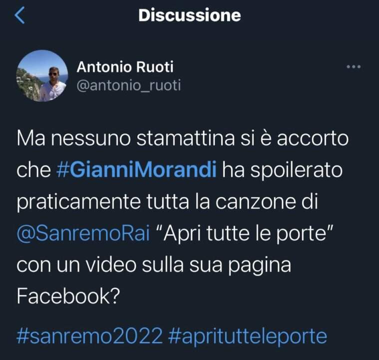 Da quello che ci è stato scritto dai nostri lettori che hanno potuto vedere il video, così come tanti altri utenti social, nella clip, una sorta di documentario sulla nascita della canzone della durata di 13 minuti, comparivano oltre a Gianni Morandi, Jovanotti (autore del brano) e Mousse T (il produttore) e in sottofondo si sentiva chiaramente l’intero brano in gara a Sanremo 2022, Apri tutte le porte.