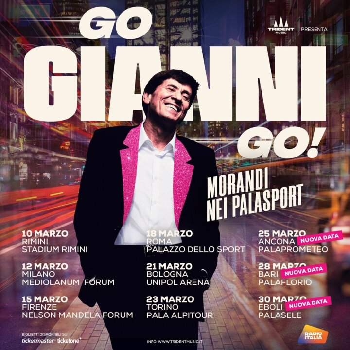 I biglietti del GO GIANNI GO! MORANDI NEI PALASPORT sono disponibili sui circuiti Ticketone e Ticketmaster.