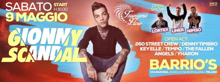 GionnyScandal, quattro dischi all’attivo e oltre 200.000 fans su Facebook, ha recentemente scoperto su YouTube un giovane rapper di 15 anni, Lortex facente parte della scuderia Tsunami Flow, e ne è rimasto letteralmente conquistato al punto da decidere di fargli aprire il suo concerto di Milano che si terrà il 9 maggio al Barrio’s.