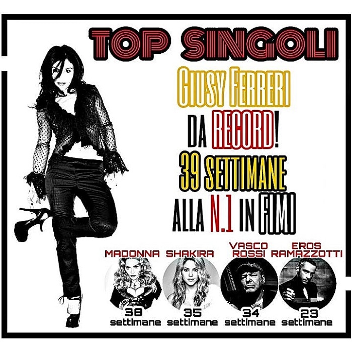 Da questa settimana Giusy Ferreri, secondo la classifica dei singoli Fimi, è l’artista con più settimane alla #1.