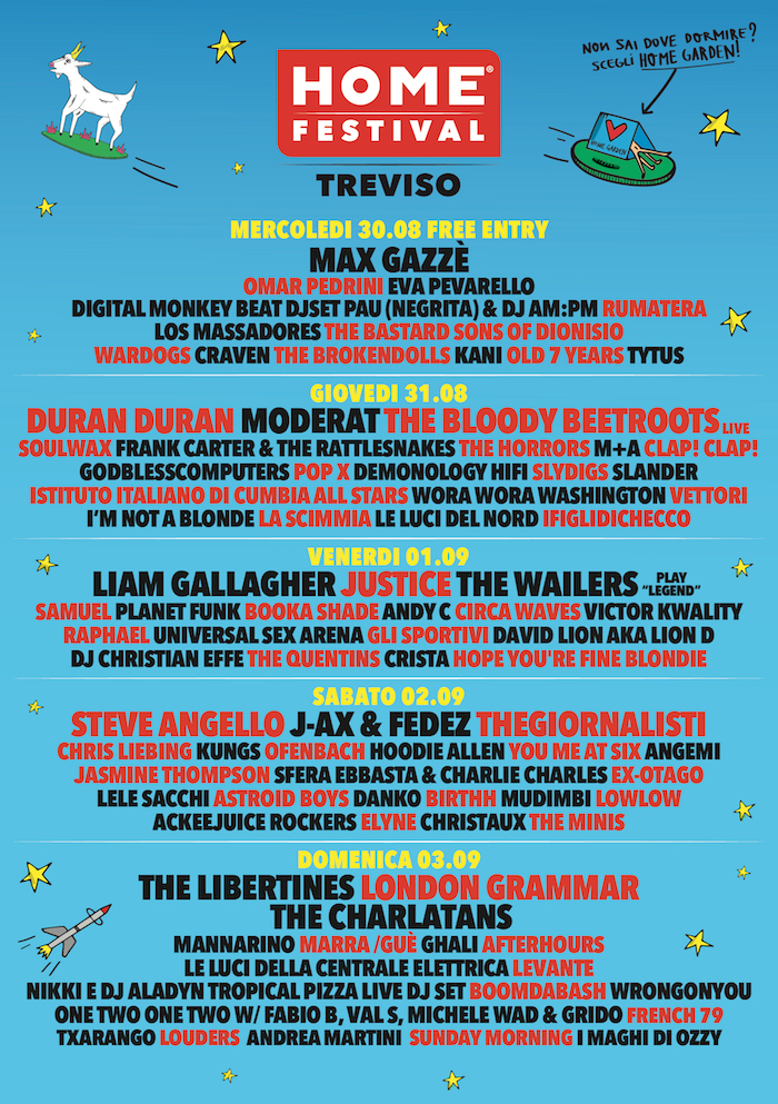 Come ogni anno la manifestazione sarà una sorta di villaggio vacanze grazie al suo camping, l’Home Garden, che permetterà a chi vorrà godersi più serate di musica di soggiornare direttamente dentro il Festival. La vicinanza al Main stage, raggiungibile a piedi, consente agli ospiti di rilassarsi e al contempo di partecipare a tutte le attività e iniziative di Home Festival, in qualsiasi momento. Quest’anno gli ospiti potranno scegliere diverse tipologie: Premium Camping, Standard, Classic, Superior (con letto matrimoniale), Basic Camping e Full Camping. E molti altri servizi, tra cui deposito bagagli, servizi bagno e docce, area lounge e food tuck, fino al trasferimento 24h/24h da e per il camping e Stazione FS di Treviso Centrale per un alloggio sicuro e di qualità. Tutte le informazioni le potete trovare qui.