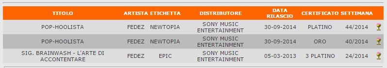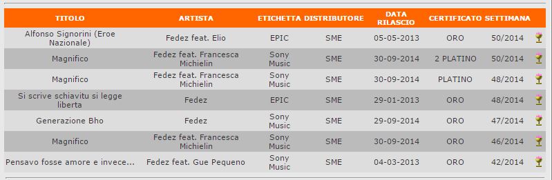 Per concludere vi mostriamo le certificazioni ottenute nel 2014 da Fedez: prima per gli album e poi quelle online.
