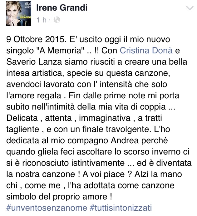 Entrato ufficialmente in rotazione radiofonica ieri venerdì 9 ottobre, A memoria, il nuovo singolo di Irene Grandi e terzo estratto dall’ ultimo album di inediti della rocker toscana; Un vento senza nome, uscito per la Sony lo scorso febbraio alla vigilia della sua partecipazione al Festival di Sanremo dopo svariati anni di silenzio artistico.