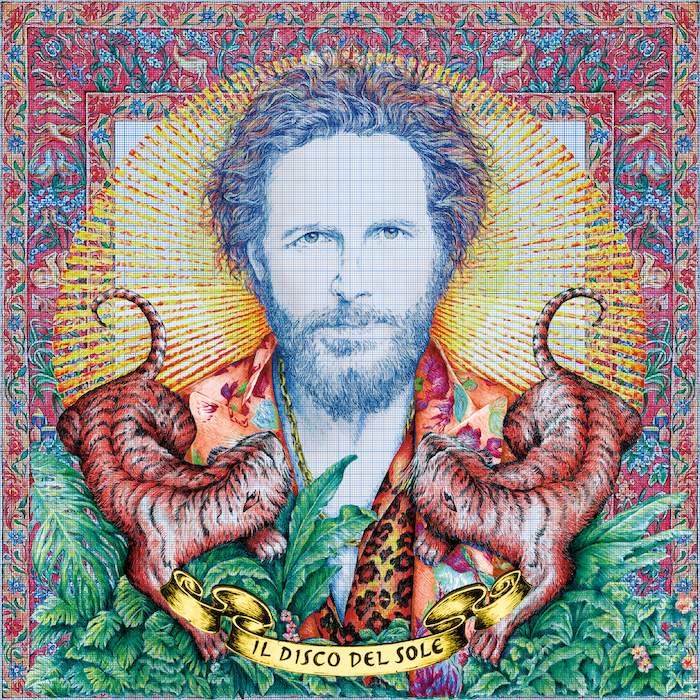 La copertina de IL DISCO DEL SOLE è realizzata da Pietro Ruffo, artista romano, e nasce dal bozzetto di un ricamo che ha dato forma a un tappeto artigianale nato dall’amicizia e dalla collaborazione con Maria Grazia Chiuri, direttore creativo di Dior, e con una fabbrica di ricami di Perugia dove Jovanotti, affezionatissimo alla manualità, ha seguito i lavori in prima persona come documentato in un originale video-racconto disponibile da oggi su JovaTv.