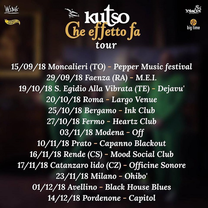 Quest’estate i Kutso hanno aperto il concerto di Fabrizio Moro allo Stadio Olimpico di Roma (Qui il nostro articolo), ma il tour, dopo l’anteprima il 15 settembre al Pepper Music Festival di Moncallieri (To) e il 29 al Mei di Faenza, partirà ufficialmente il prossimo 19 ottobre. Sarà l’occasione per ascoltare i brani storici e quelli del nuovo album Che Effetto Fa.