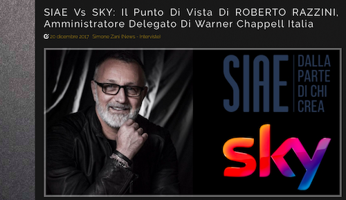 …a Roberto Razzini, oltre che per parlare del suo ruolo alla Warner Chappell Italia (vedi qui), anche per quel che riguarda la questione Siae VS Sky. Perché per noi è importante cercare di far capire ai nostri lettori dinamiche che spesso non conoscono e, sopratutto, farlo in modo comprensibile a tutti.