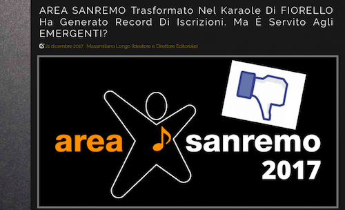 Abbiamo poi ricevuto diverse mail e messaggi riguardo all’ultima edizione di Area Sanremo. Un’edizione che non ci è piaciuta per niente nella modalità di selezione. Avremmo potuto tacere e avere molti più amici, ma preferiamo sentirci sempre con la coscienza a posto e dalla parte degli emergenti, sperando che il prossimo anno le cose cambieranno.