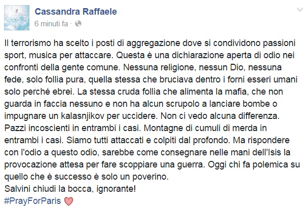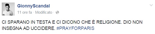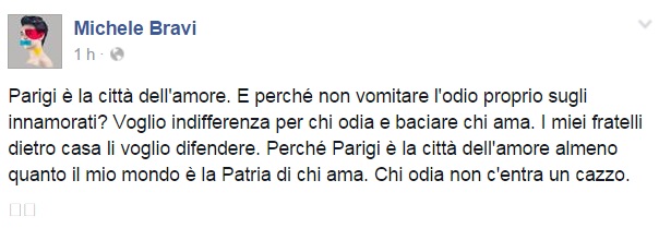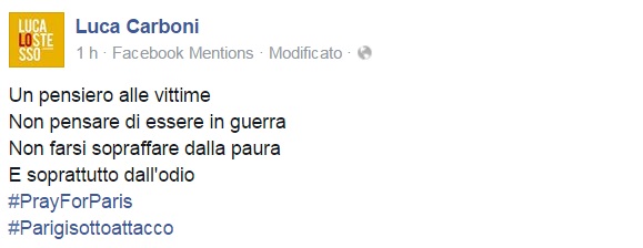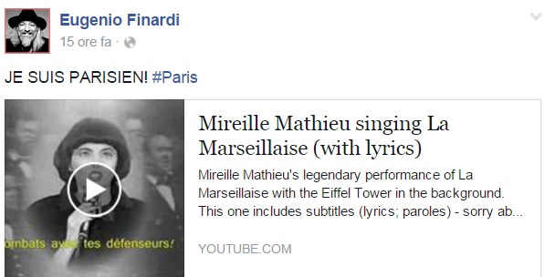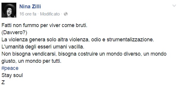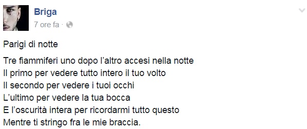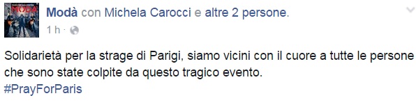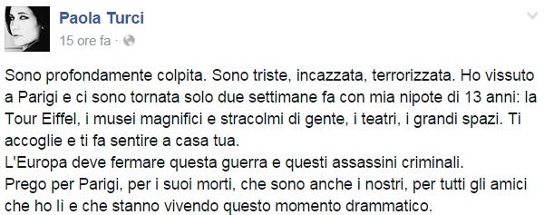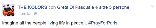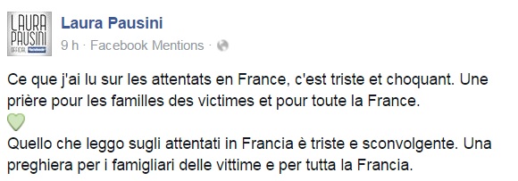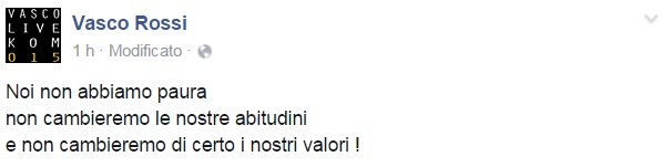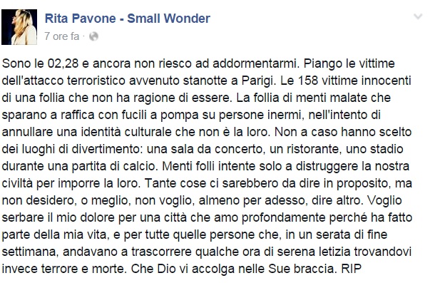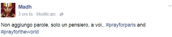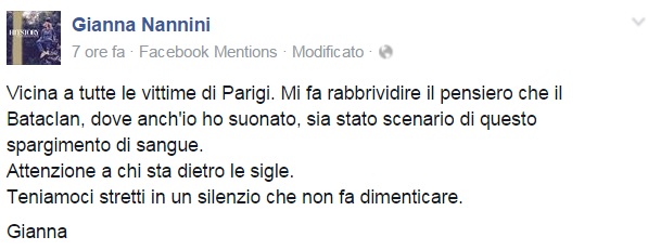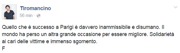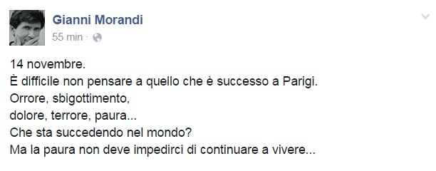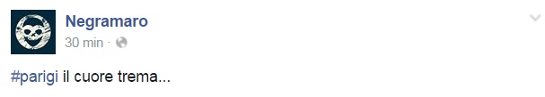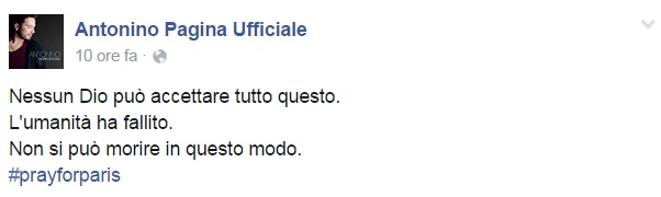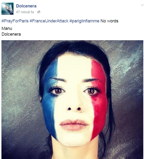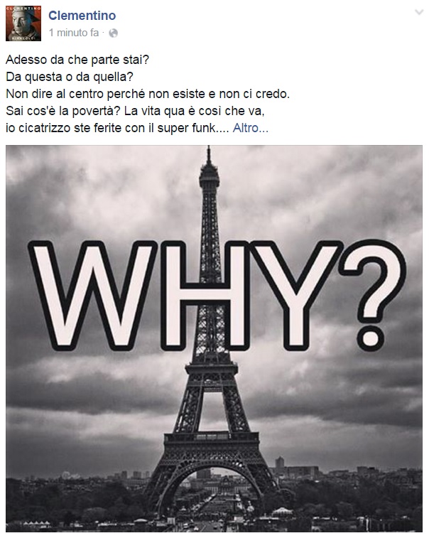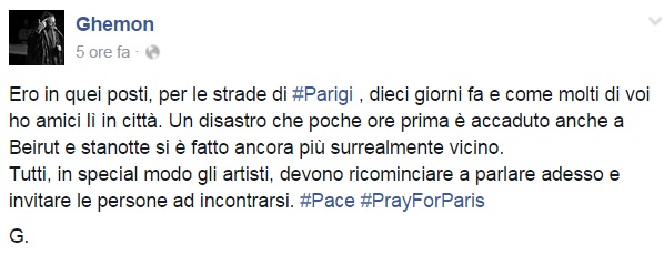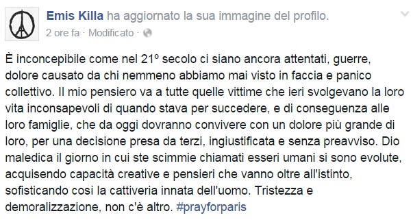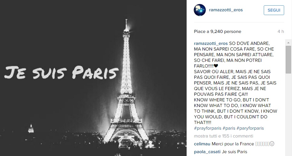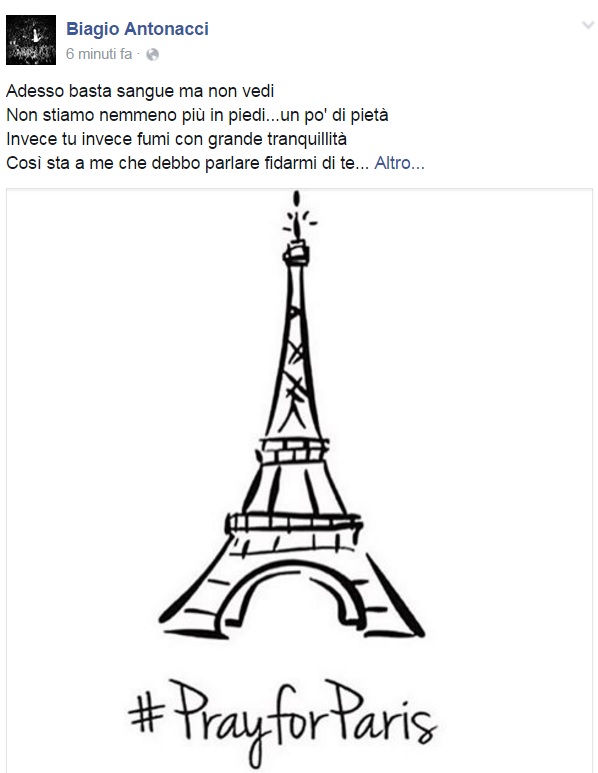 Da Eros Ramazzotti a Emis Killa, da Laura Pausini ai Negramaro, da Alessandra Amoroso a Emma, ognuno sceglie di avvicinarsi alla tragedia a modo proprio, molti scelgono solamente di condividere un’immagine, molti portano sulle proprie bacheche un pezzo simbolo come Imagine di John Lennon per fare in modo che sia la musica a veicolare il proprio pensiero, come IlCile che la accompagna una lunga riflessione personale. Biagio Antonacci sceglie invece di condividere il testo di Henna, prezioso pezzo simbolo contro la guerra nato dal genio di Lucio Dalla. Clementino invece da spazio al testo della sua Da Che Parte Stai?, duetto postumo tra lui e Pino Daniele che ben si sposa con l’atmosfera che si respira oggi sul web e nelle nostre città.