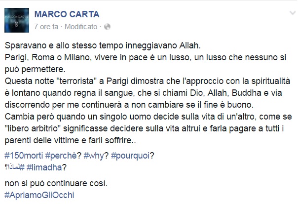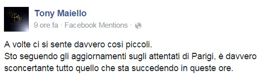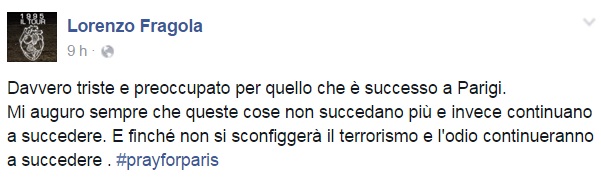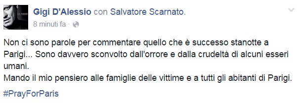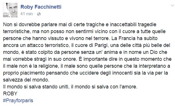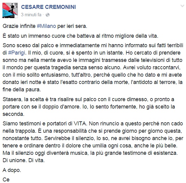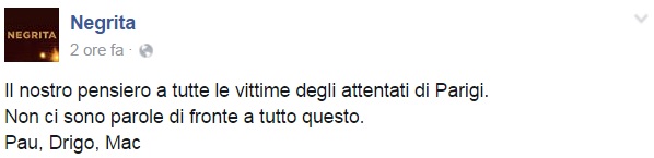 A Parigi si trovava Pacifico, noto musicista e autore (tra le più recenti collaborazioni ricordiamo quelle con Malika Ayane realizzate proprio nella capitale francese) che nella notte ha rassicurato tutti sulla propria situazione, tra il sollievo e lo sconcerto.