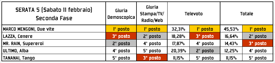Ultimo, secondo durante tutta la settimana, scivola al quarto posto finale pur raccogliendo un cospicuo 20,39% al televoto: è soprattutto la sala stampa, che lo elegge fanalino di coda, a distruggere le sue possibilità dopo il secondo posto già raccolto nel 2019. Infine Tananai, mai in gara in questo round finale, ma comunque in grado di togliersi una soddisfazione grazie al buon supporto della Sala Stampa: confrontata con l’ultimo posto di Sesso occasionale ottenuto solo dodici mesi fa, la quinta posizione raccolta da Tango è sicuramente un piazzamento pregevole e di cui il giovane interprete di Cologno Monzese può dirsi più che soddisfatto.