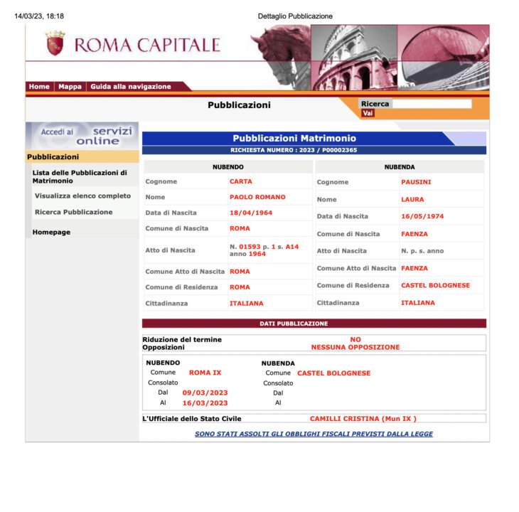 La notizia è stata diramata però dal Comune di Roma sul cui sito sono apparse le pubblicazioni del matrimonio.