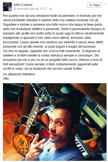 Per quanto non sia una decisione facile da prendere, é divenuto per me ormai inevitabile chiudere il capitolo della mia carriera musicale con gli Sugarfree e iniziare a scriverne uno tutto nuovo che segua le linee guida della mia evoluzione artistica e personale. Sento il prorompente bisogno di lasciarmi alle spalle una realtà entro la quale oggi mi ritrovo creativamente imprigionato e spiccare il volo verso nuovi stimoli, emozioni, idee, innovazioni. Lascio questa mia creatura con serenità e senza alcun attrito personale con gli altri membri, ai quali auguro il meglio del successo.