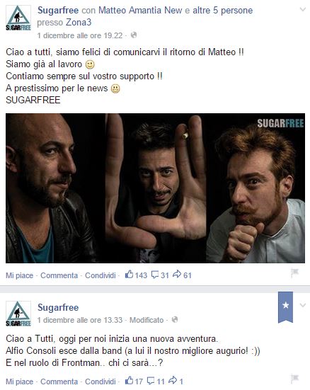 Da qualche anno era rientrato nelle fila degli Sugarfree Alfio Consoli, storico fondatore della band nonché voce e frontman, ruolo preso da Matteo Amantia nel 2004, poco prima della pubblicazione del singolo Cleptomania. Alfio si riprende il suo posto nel 2008 e, il 1° dicembre 2014 viene annunciata la sua nuova uscita dalla formazione e il rientro (di nuovo) di Matteo Amantia. Ecco i post, di Alfio sulla sua pagina personale e della band che annuncia anche il nuovo ingresso: