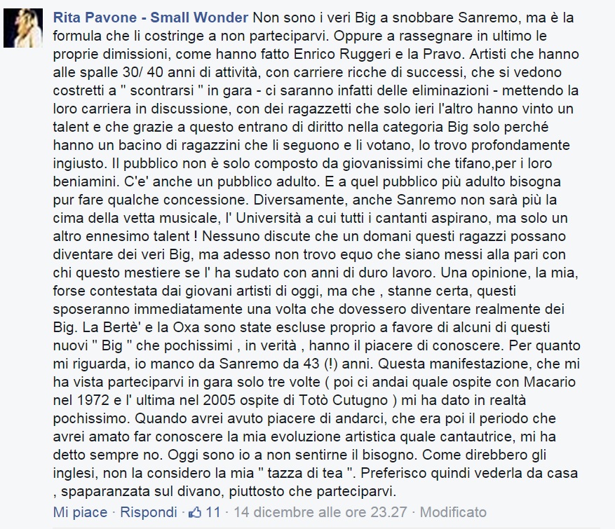 Un pensiero accennato, deciso ma non violento, come sa essere lo stile della storica voce italiana, capace di scatenare da subito commenti e curiosità di moltissimi, che hanno spinto la Pavone a dettagliare maggiormente il proprio pensiero, sottolineando che la volontà di partecipazione tra i veri “grandi” rischia di scomparire perché “…non sono i veri Big a snobbare Sanremo, ma è la formula che li costringe a non parteciparvi. Oppure a rassegnare in ultimo le proprie dimissioni, come hanno fatto Enrico Ruggeri e la Pravo. Artisti che hanno alle spalle 30/ 40 anni di attività, con carriere ricche di successi, che si vedono costretti a ” scontrarsi ” in gara – ci saranno infatti delle eliminazioni – mettendo la loro carriera in discussione, con dei ragazzetti che solo ieri l’altro hanno vinto un talent e che grazie a questo entrano di diritto nella categoria Big solo perché hanno un bacino di ragazzini che li seguono e li votano, lo trovo profondamente ingiusto.” Una scelta che non trova giustificazione nelle intenzioni di rinnovamento, in quanto il pubblico del Festival è eterogeneo e “…non è solo composto da giovanissimi che tifano,per i loro beniamini. C’e’ anche un pubblico adulto. E a quel pubblico più adulto bisogna pur fare qualche concessione. Diversamente, anche Sanremo non sarà più la cima della vetta musicale, l’ Università a cui tutti i cantanti aspirano, ma solo un altro ennesimo talent ! Nessuno discute che un domani questi ragazzi possano diventare dei veri Big, ma adesso non trovo equo che siano messi alla pari con chi questo mestiere se l’ ha sudato con anni di duro lavoro. Una opinione, la mia, forse contestata dai giovani artisti di oggi, ma che, stanne certa, questi sposeranno immediatamente una volta che dovessero diventare realmente dei Big…”, una richiesta di riconoscimento dell’esperienza, non come atto dovuto a rendere intoccabili gli artisti attivi da decenni, ma solo per garantirne il rispetto che a livello artistico ci si guadagna sul campo tanto quanto nella vita reale in qualsiasi mestiere, una considerazione venuta meno secondo l’artista in quanto “…La Bertè’ e la Oxa sono state escluse proprio a favore di alcuni di questi nuovi ” Big ” che pochissimi, in verità , hanno il piacere di conoscere. …”