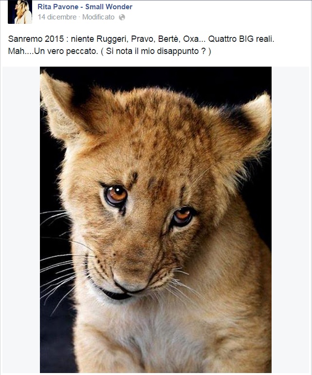 La foto di un cucciolo di leone, con lo sguardo tra il tenero e il malinconico, a simboleggiare la perplessità dinnanzi ad una manifestazione che avrebbe scelto di escludere i veri leoni della musica leggera, che con il loro ruggito hanno costruito la storia della musica italiana e del Festival stesso. Un Festival senza Enrico Ruggeri, Patty Pravo (che scopriremo essersi “autoeliminati”), Anna Oxa e Loredana Bertè che secondo Rita avrebbero rappresentato 4 nomi di primo livello, artisti che l’organizzazione del Festival non si sarebbe dovuta lasciar scappare.