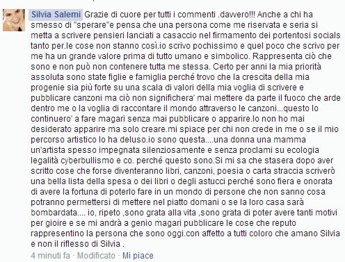 “Grazie di cuore per tutti i commenti. davvero!!! Anche a chi ha smesso di “sperare” e pensa che una persona come me riservata e seria si metta a scrivere pensieri lanciati a casaccio nel firmamento dei portentosi socials tanto per. le cose non stanno così. io scrivo pochissimo e quel poco che scrivo per me ha un grande valore prima di tutto umano e simbolico. Rappresenta ciò che sono e non può non contenere tutta me stessa. Certo per anni la mia priorità assoluta sono state figlie e famiglia perché trovo che la crescita della mia progenie sia più forte su una scala di valori della mia voglia di scrivere e pubblicare canzoni ma ciò non significherà mai mettere da parte il fuoco che arde dentro me e la voglia di raccontare il mondo attraverso le canzoni… questo lo continuerò a fare mannari senza mai pubblicare o apparire. Io non ho mai desiderato apparire ma solo creare. mi spiace per chi non crede in me o se il mio percorso artistico lo ha deluso. io sono questa… una donna una mamma un’artista spesso impegnata silenziosamente e senza proclami su ecologia legalità cyberbullismo e co. perché questo sono. Si mi sa che stasera dopo aver scritto cose che forse diventeranno libri, canzoni, poesia o carta straccia scriverò una bella lista della spesa o dei libri o degli astucci perché sono fiera e onorata di avere la fortuna di poterlo fare in un mondo di persone che non sanno cosa potranno permettersi di mettere nel piatto domani o se la loro casa sarà bombardata… Io, ripeto, sono grata alla vita, sono grata di poter avere tanti motivi per gioire e se mi andrà a genio magari pubblicare le cose che reputo rappresentino la persona che sono oggi. Con affetto a tutti coloro che amano Silvia e non il riflesso di Silvia“.