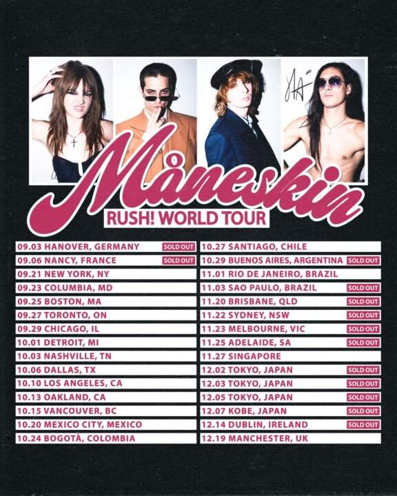E, a proposito di tour, il 3 settembre – da Hannover, in Germania – prenderà il via il RUSH! World Tour, che vedrà i Maneskin esibirsi nelle maggiori arene del Nord America, Sud America (Argentina, Brasile, Cile e Colombia), Giappone, Regno Unito, Europa e – per la prima volta – anche in Australia.