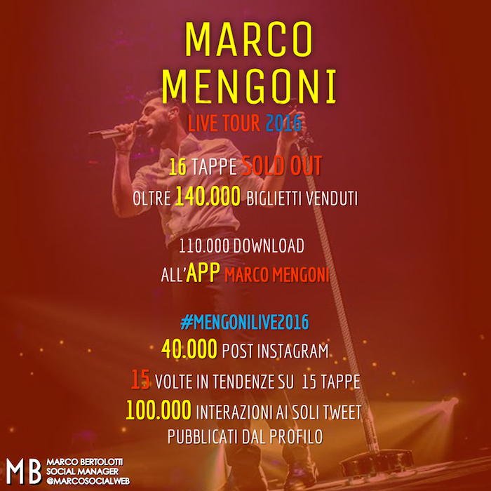 Ieri sera si è chiusa la prima parte del #MENGONILIVE2016. 16 date sold out con oltre 140.000 biglietti venduti e numeri da record sui social per Marco Mengoni.