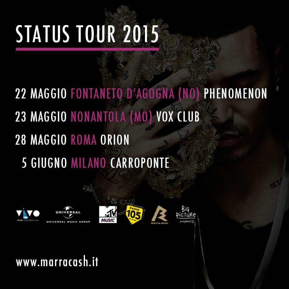 Marracash è pronto per tornare sui palchi dei club italiani e portare in giro la sua musica dopo l’uscita dell’attesissimo album intitolato Status (pubblicato il 20 gennaio, Universal Music) subito premiato dal pubblico debuttando al numero 1 della classifica di iTunes, al 2 di quella FIMI e rimanendo in top 10 per 3 settimane.
