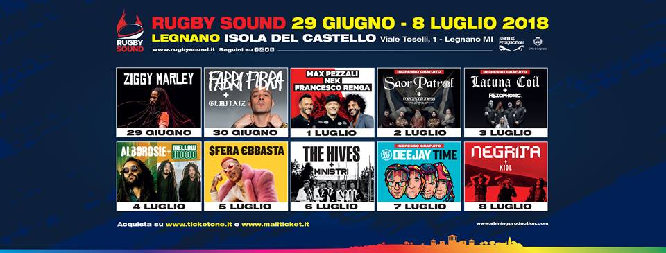 Il Rugby Sound Festival è uno degli appuntamenti fissi dell’estate altomilanese. Le prime due date sono state un vero e proprio successo! Oltre a Max Pezzali, Nek e Francesco Renga, che hanno infiammato la folla domenica 1 luglio, l’opening del 29 giugno è stato affidato a Ziggy Marley, mentre il 30 giugno si sono esibiti Fabri Fibra e Gemitaiz.